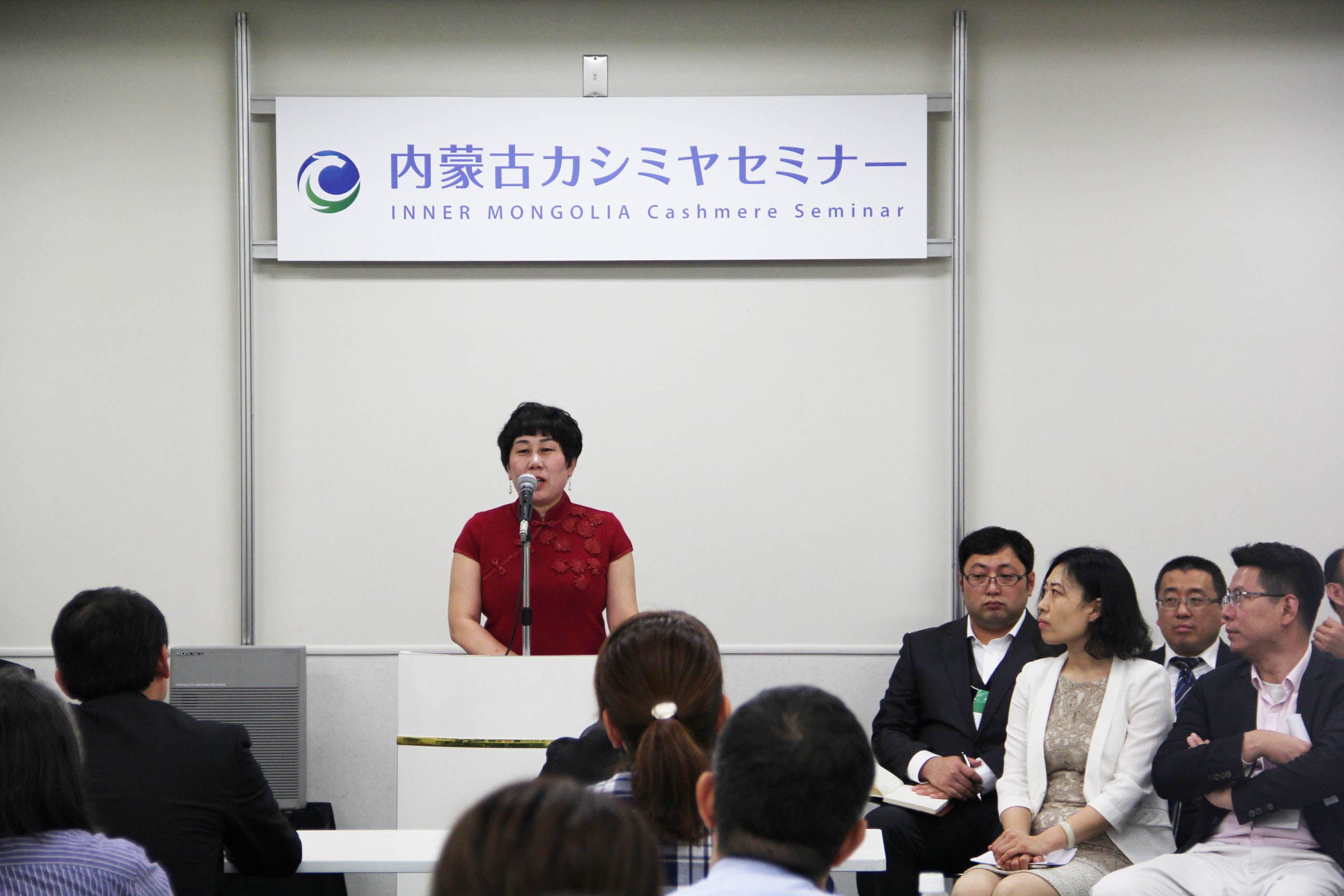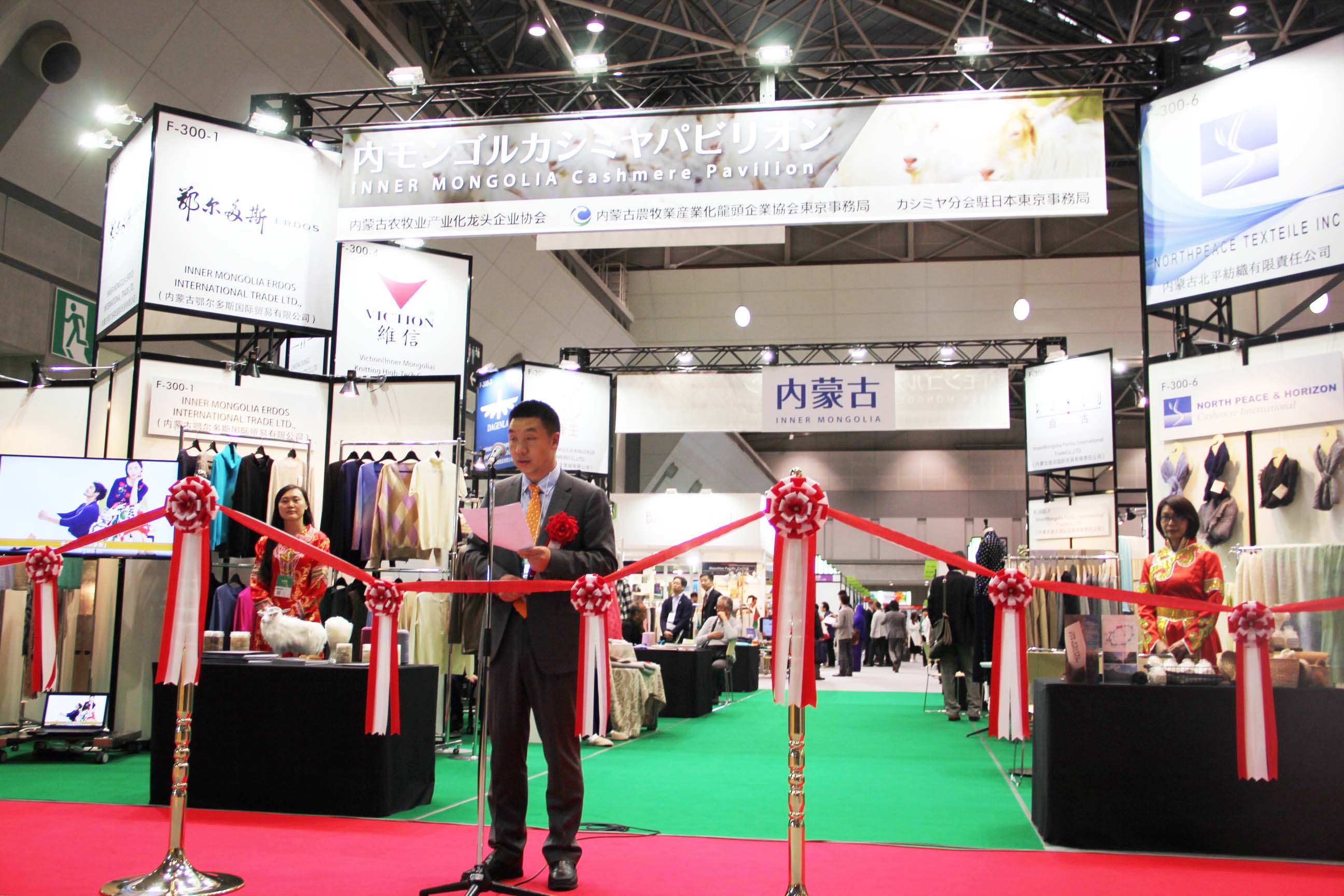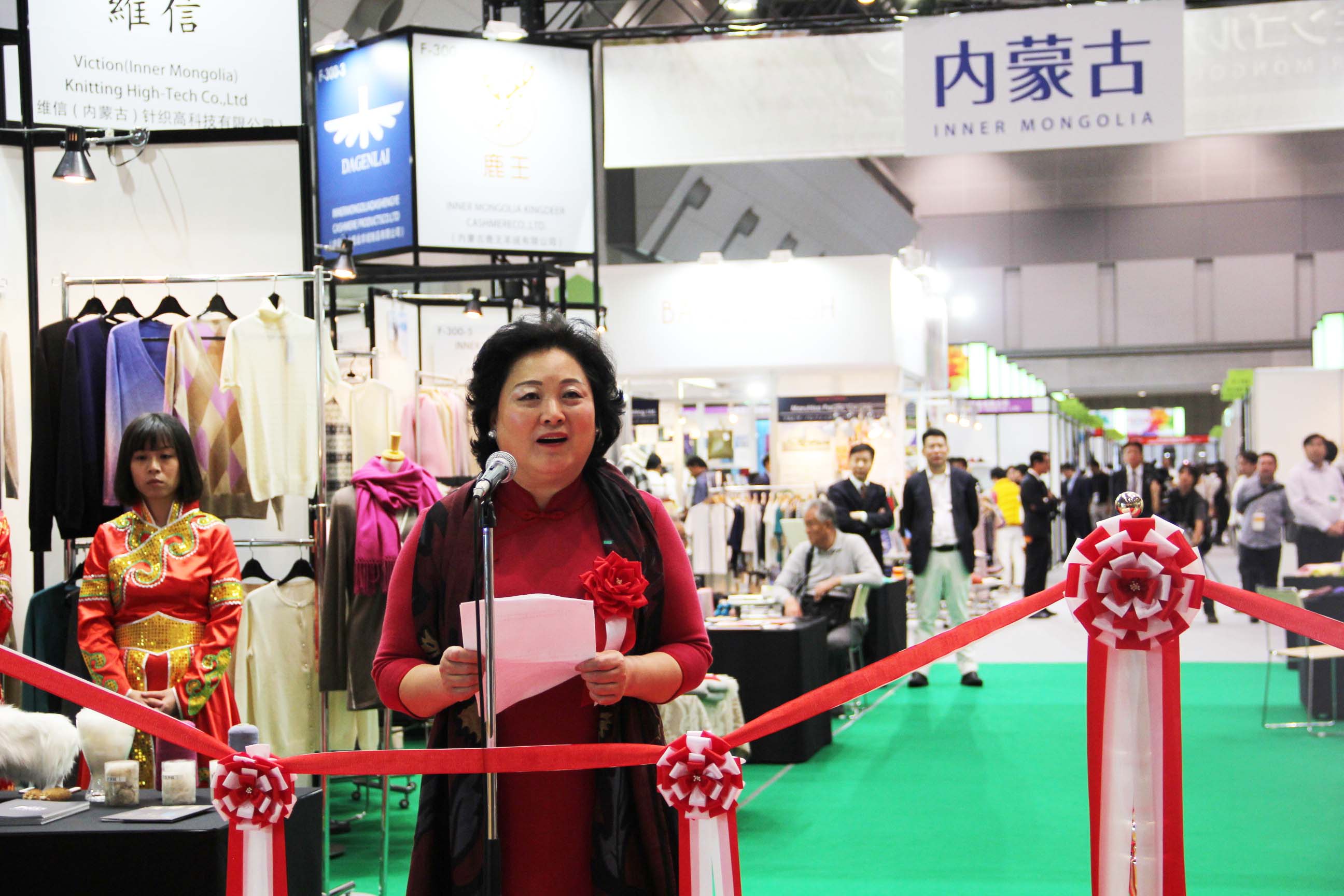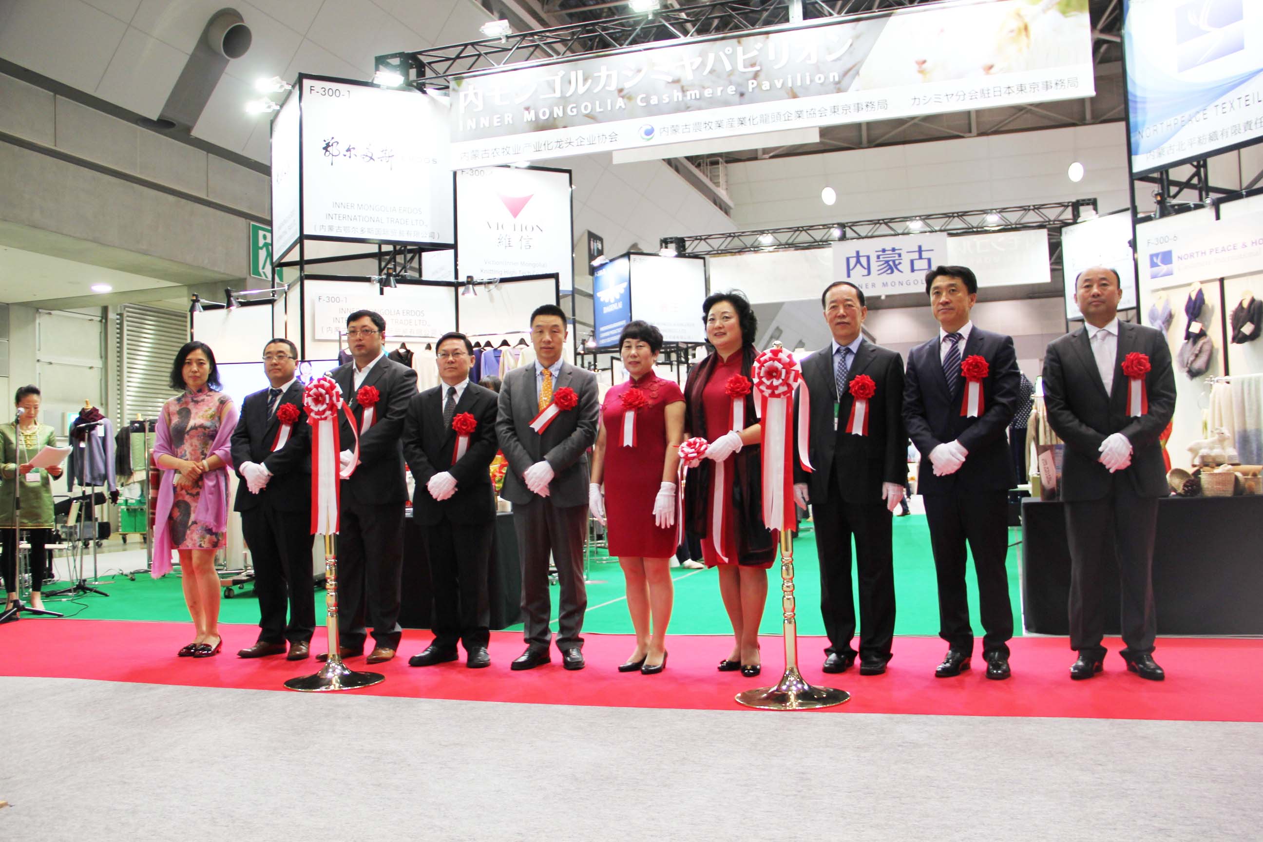 2016426日上午11時(shí),在內(nèi)蒙古羊絨展區(qū)前,舉行了盛大的開業(yè)剪彩儀式,內(nèi)蒙古自治農(nóng)牧業(yè)廳產(chǎn)業(yè)化處副處長郟金梅、內(nèi)蒙古農(nóng)牧產(chǎn)業(yè)化龍頭企業(yè)協(xié)會(huì)會(huì)長閆樹春、內(nèi)蒙古農(nóng)牧產(chǎn)業(yè)化龍頭企業(yè)協(xié)會(huì)羊絨產(chǎn)業(yè)分會(huì)會(huì)長王風(fēng)之出席剪彩儀式,并分別就政府支持、協(xié)會(huì)服務(wù)和企業(yè)自律發(fā)展等幾方面做了精彩致辭。郟金梅副處長表示,希望通過此次活動(dòng),使得社會(huì)各界代表能夠贏得機(jī)遇、拓展空間,取得豐碩的成果,同時(shí)真誠盼望各方來賓、新老朋友能夠進(jìn)一步了解內(nèi)蒙古羊絨,認(rèn)識(shí)內(nèi)蒙古羊絨,并以此為契機(jī),加強(qiáng)內(nèi)蒙古羊絨界與日本企業(yè)的合作,攜手發(fā)展,實(shí)現(xiàn)共贏,共創(chuàng)輝煌。閆樹春會(huì)長在致辭中講到,我們此行不僅是要展示內(nèi)蒙古羊絨原料優(yōu)勢(shì)地位和行業(yè)加工的專業(yè)性,更希望能充分利用各個(gè)平臺(tái)廣泛交流,探討合作途徑的契合點(diǎn),推動(dòng)兩國羊絨行業(yè)多方共贏,共同提升全球市場(chǎng)對(duì)羊絨產(chǎn)品的認(rèn)知度,希望我們的羊絨企業(yè)能團(tuán)結(jié)一致,實(shí)現(xiàn)羊絨產(chǎn)業(yè)的可持續(xù)發(fā)展。羊絨產(chǎn)業(yè)分會(huì)會(huì)長王風(fēng)之在致辭中表示,通過內(nèi)蒙古農(nóng)牧業(yè)產(chǎn)業(yè)化龍頭企業(yè)協(xié)會(huì)羊絨分會(huì)的平臺(tái),我們勢(shì)必會(huì)在培育超細(xì)超長型產(chǎn)絨山羊、提升優(yōu)質(zhì)種群的規(guī)模、建立行業(yè)質(zhì)量標(biāo)準(zhǔn)和抱團(tuán)發(fā)展,積極進(jìn)行海外市場(chǎng)渠道、品牌、投資等多方面取得突破性進(jìn)展,致力于將中國內(nèi)蒙古羊絨打造成為全球性的產(chǎn)業(yè)品牌。