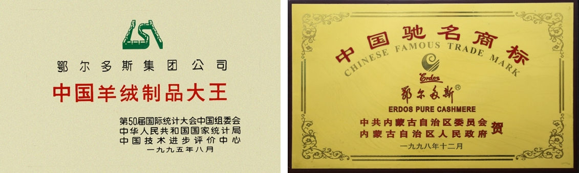 △左:1995年鄂爾多斯集團榮獲“中國羊絨制品大王”稱號;右:1998年,鄂爾多斯品牌榮獲“中國馳名商標(biāo)”榮譽。