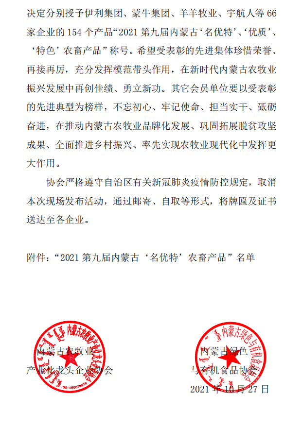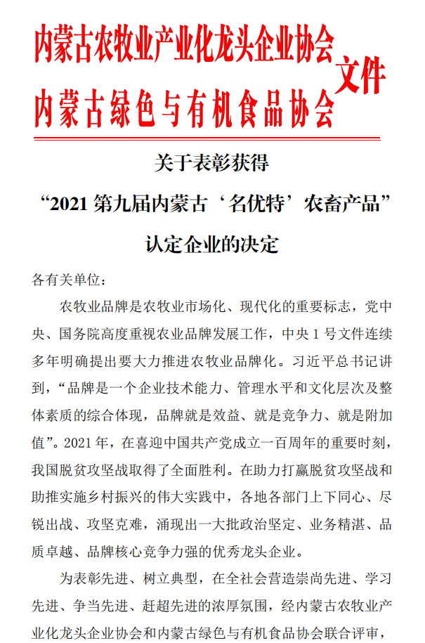 關(guān)于表彰獲得 “2021第九屆內(nèi)蒙古‘名優(yōu)特’農(nóng)畜產(chǎn)品”認(rèn)定企業(yè)的決定