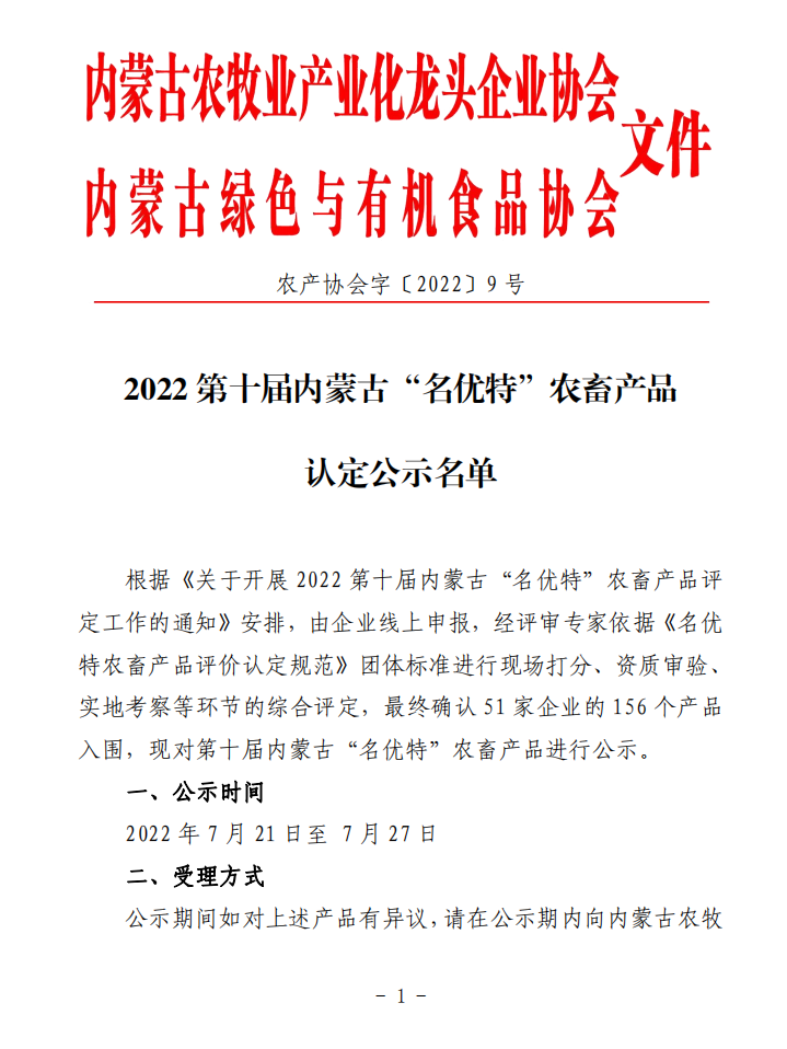 2022第十屆內(nèi)蒙古“名優(yōu)特”農(nóng)畜產(chǎn)品認(rèn)定公示名單