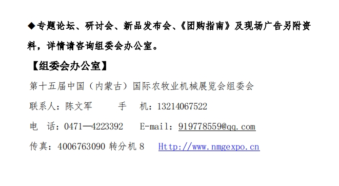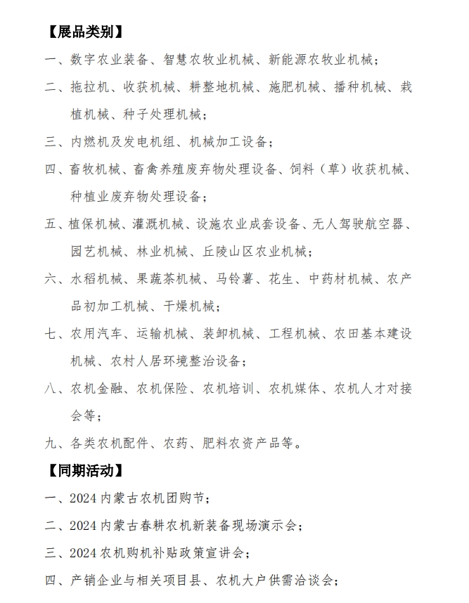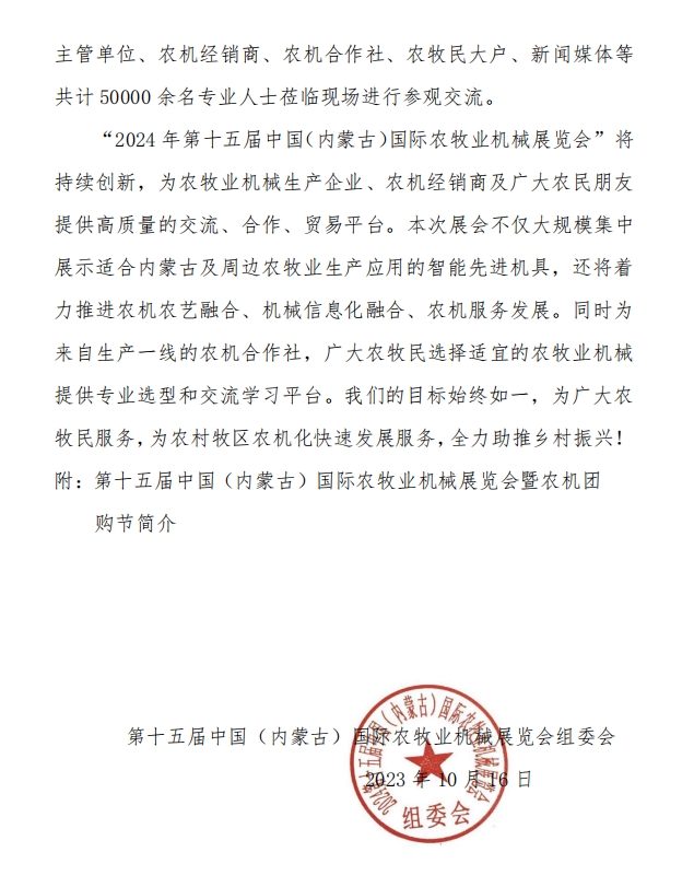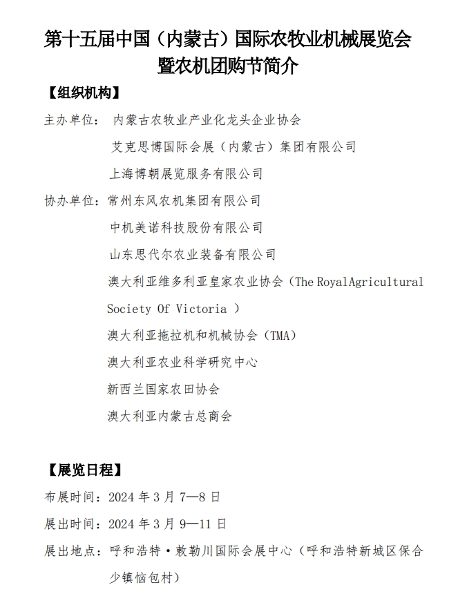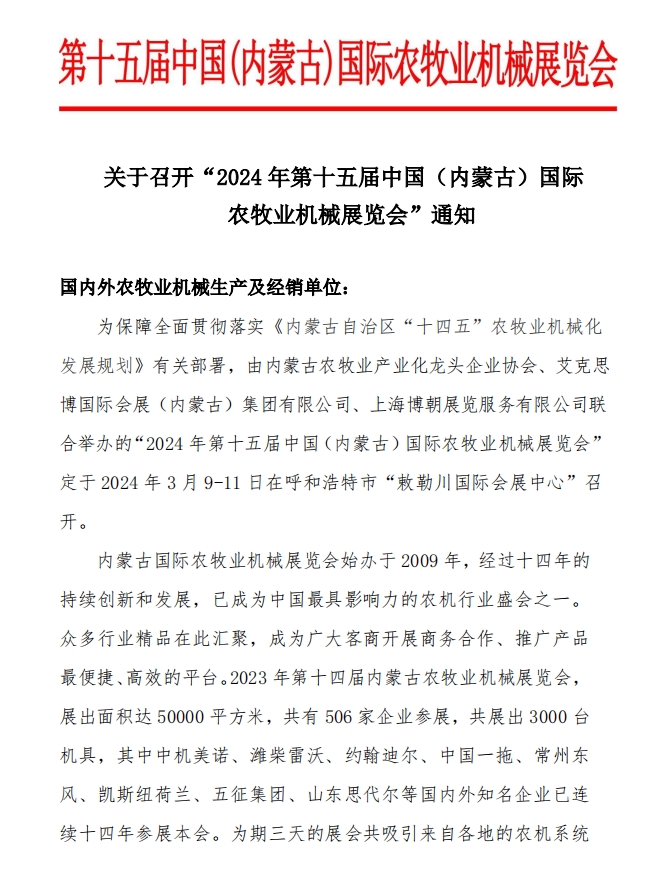 關(guān)于召開“2024年第十五屆中國(內(nèi)蒙古)國際農(nóng)牧業(yè)機(jī)械展覽會(huì)”通知