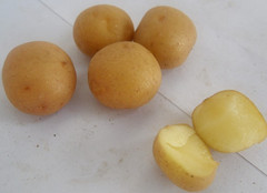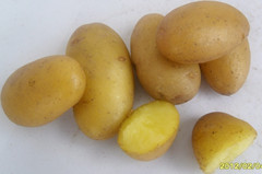 FAVORITA(費烏瑞它)1981年由國家農(nóng)業(yè)部種子局從荷蘭引入,山東省農(nóng)業(yè)科學(xué)院蔬菜花卉所引入山東栽培,取名“魯引1號”,1989年天津市農(nóng)業(yè)科學(xué)院蔬菜花卉所引入,取名“津引8號”,又名“荷蘭薯”、“荷蘭七號”、“荷蘭15”,為我國主栽早熟品種之一,該品種出苗后60—70天即可收獲。 [特征特性]該品種早熟,株型直立,株高約60cm左右,莖桿粗壯,分枝少,葉片肥大,葉緣波狀,花淡紫色;結(jié)薯集中,薯塊膨大迅速,長橢圓形,芽眼淺,黃皮黃肉,表皮光滑,食味好,適合加工和出口創(chuàng)匯,在香港及東南亞各國極為暢銷;抗馬鈴薯Y病毒,對A病毒免疫;淀粉12.4%—14%,還原糖0.03%。植株易感晚疫病。塊莖感晚疫病和環(huán)腐病。輕感青枯病、退化快。產(chǎn)量高,畝產(chǎn)2000kg,高產(chǎn)可達3000kg以上。 [適宜范圍]該品種適宜性較廣,黑龍、遼寧、內(nèi)蒙古、河北、北京、山東、江蘇、廣東、廣西、貴州、四川等地均有種植,是適宜出口的品種。